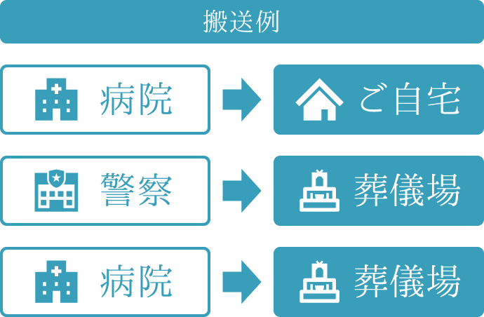 ご遺体お迎えサービスとは、故人様の大切なご遺体を、専門知識を備えたプロが専用の車両でご指定の場所まで丁寧にお送りするサービスです。近隣でも、遠方でもお電話一本で迅速・丁寧に旅立ちのお手伝いをさせていただきます。